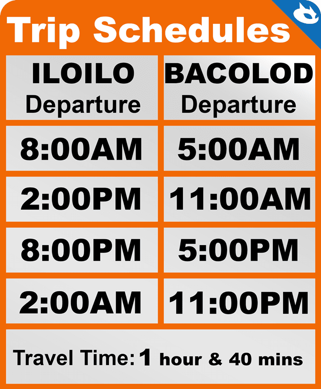 5:00 am – 7: 00 am from Bacolod to Iloilo via FastCat (see below for the fare and schedule )