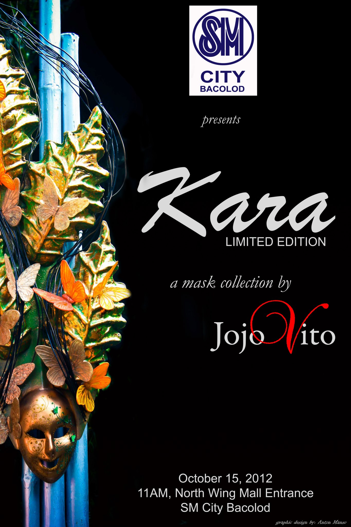 Jojo Vito Designs Gallery will stage “KARA”, a one-man exhibit of Mask Collection at SM City Bacolod on October 15-22, 2012. The exhibit will showcase new mask designs in various forms such as wall decors, lamps, wearables, table tops, jewelled, and much more. Vito interpreted the 2012 Masskara theme: “Life is good in Bacolod” in every mask to be shown in the exhibit.