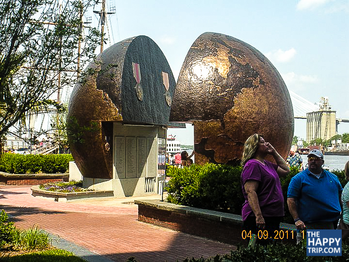 Another, significant place I’ve visited in Savannah, Georgia is Chatham World war II Monument. Officially titled “A World Apart,” it’s a 20-foot-high globe split down the middle to symbolize a world divided by war into Pacific and European Theaters. The designers of the Chatham County World War II Monument in Savannah, GA wants people to remember WWII was no ordinary dust up.