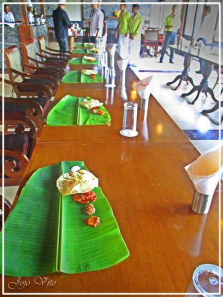 Upon entering the dining hall I saw several banana leaves lined on the table while the resort’s waiters were putting some food in it. Instantly, I knew that they were up to let us try something traditional – something that’s very Kerala. When we were all seated, the Resort’s Manager Mr. Vinod M M, started to explain what they have prepared for us.