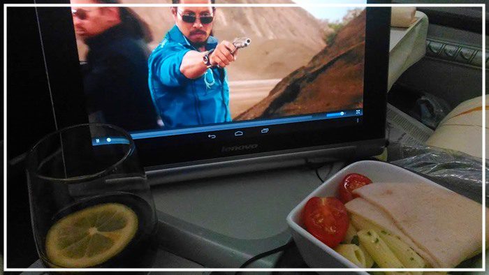 enjoying a movie while dining on board SilkAir