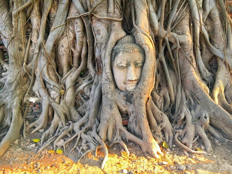 The well-photographed Buddha head in Wat Mahathat, Ayuttaya, Thailand
