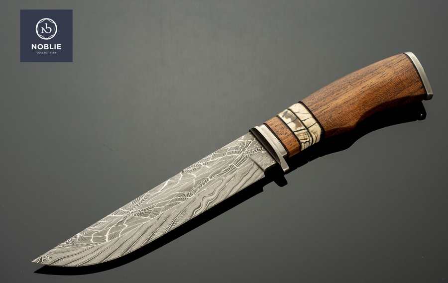 When production blades still leave you wanting something singular, Noblie answers with gallery-grade steel. We handled their Mosaic Damascus Hunter (model #1731) and found a blade that doubles as art piece and field scalpel. Forged from 15N20, O-1, and W1 tool steels, its kaleidoscopic tiles flow seamlessly into a sculpted guard and exotic-wood grip — craftsmanship that photographs struggle to capture.