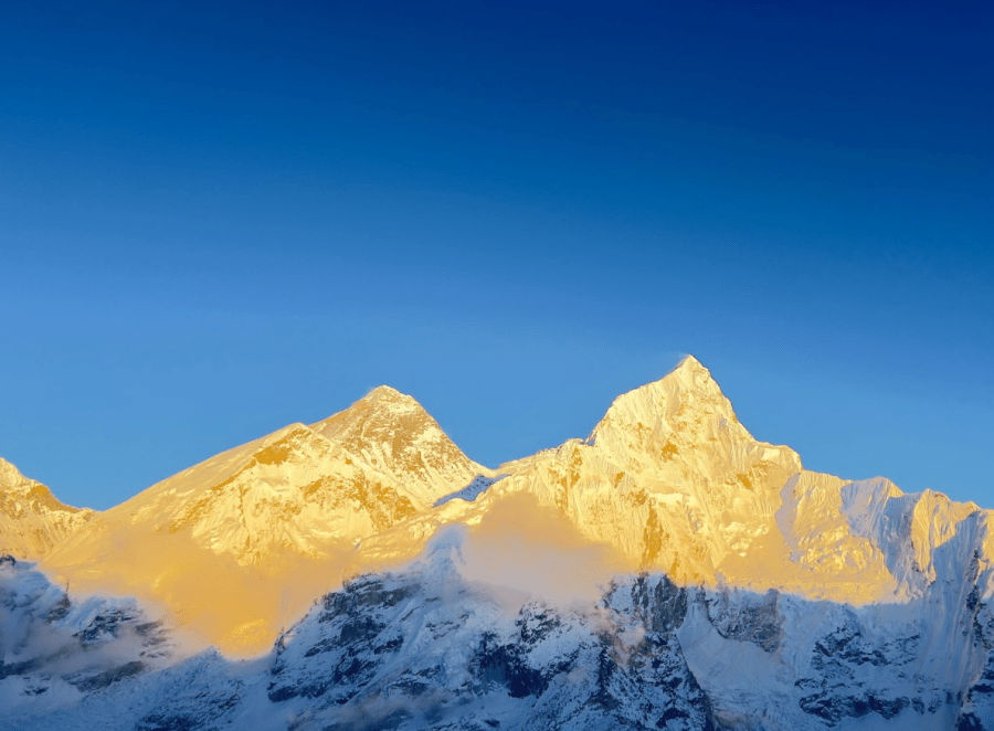 Kala Patthar (5,555m), climbed from Gorak Shep, delivers the most direct and unobstructed view of Everest. The ascent is steep and oxygen-thin, typically requiring 2–3 hours. Many trekkers choose sunrise, when the air is still, and light reveals the summit face of Everest alongside Pumori, Lhotse, and Nuptse. Cold temperatures and high wind exposure require warm layers and proper headgear.